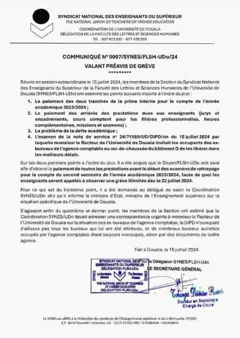À l’occasion, la coordination du Syndicat des enseignants du supérieur (Synes) de ladite faculté vient d’adresser au doyen, Robert Kpwang Kpwang, un préavis un préavis de grève illimitée qui prendra effet dès le 22 juillet 2024… Tout un scandale ! Lire le Communiqué du Synes.
