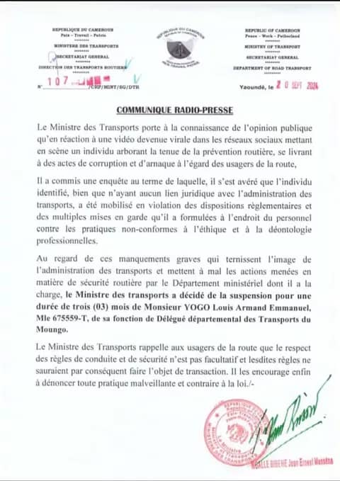 En réaction à une vidéo devenue virale dans les réseaux sociaux où un individu arborant la tenue de la prévention routière se livre à des actes de corruption et d’arnaque à l’égard des usagers de la route sur l’axe Douala-Bafoussam, alors que le concerné n’a aucun lien juridique avec le ministère des transports, le ministre Jean Ernest Masséna Ngalle Bibehe a décidé de suspendre pour 3 mois monsieur Yogo Louis Armand Emmanuel de sa fonction de délégué départemental des transports du Moungo. Lire la suite …