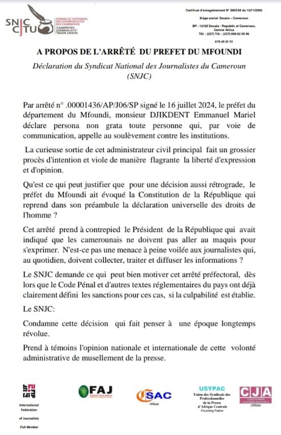 ARRÊTÉ DU PRÉFET DJIKDENT PORTANT INTERDICTION DE SÉJOUR DANS LE DÉPARTEMENT DU MFOUNDI: Le SNJC condamne cette décision qui fait penser à une époque longtemps révolue…
