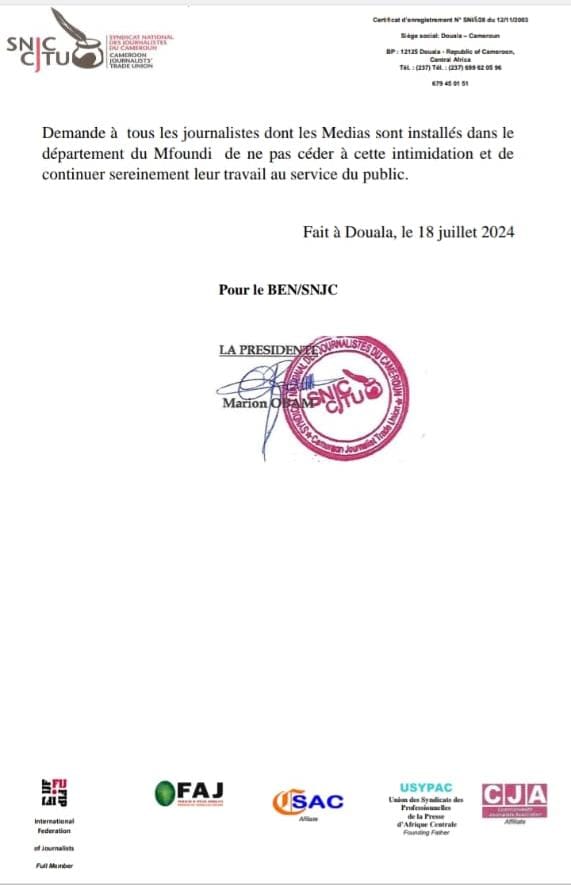 À travers une déclaration signée, le 18 juillet 2024, par sa présidente Marion Obam, le syndicat national des journalistes du Cameroun(SNJC) demande à tous les journalistes dont les médias sont installés dans le département du Mfoundi de ne pas céder à cette intimidation et de continuer leur travail au service du public…Lire la déclaration du SNJC