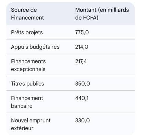 Pour couvrir ces besoins massifs, le Gouvernement a détaillé une stratégie de financement reposant sur plusieurs leviers : «Prêts projets: 775 milliards de FCFA ; Appuis budgétaires: 214 milliards de FCFA ; Financements exceptionnels: 217,4 milliards de FCFA ; Titres publics:350 milliards de FCFA ; Financement bancaire: 440,1milliards de FCFA ; Nouvel emprunt extérieur: 330 milliards de FCFA.»