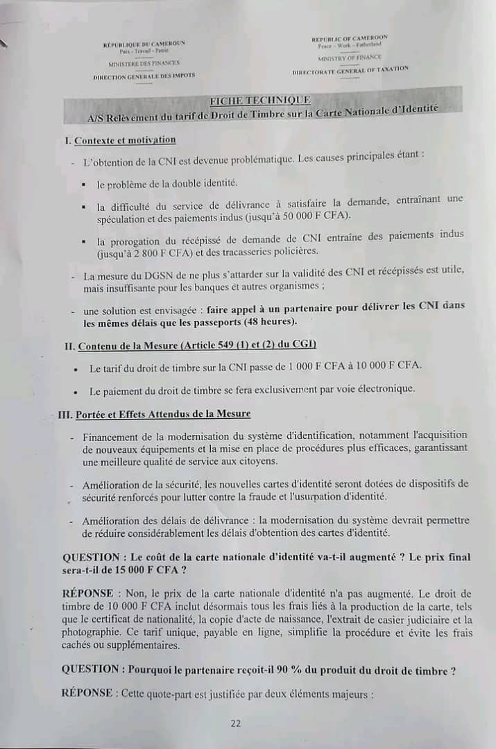 CARTE NATIONALE D’IDENTITÉ : Éclairage sur le coût qui passe de 2800 à 10000 Frs CFA… Navigation de l’article NOMINATIONS À L’ONIES : Ferdinand Ngoh Ngoh annule les décisions de Joseph Antoine Bell CAMEROUN : Brenda Biya, fille du président,au coeur du débat sur l’homosexualité