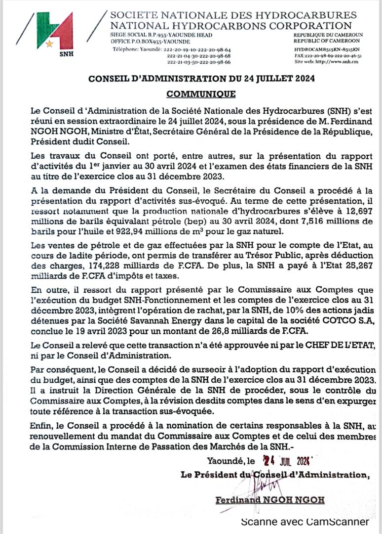 Annoncé pour se tenir le 14 juillet dernier au siège de la société nationale des hydrocarbures(SNH) à Yaoundé, c’est finalement le 24 juillet 2024 que le conseil d’administration extraordinaire de la SNH a eu lieu, en l’absence de son directeur général Adolphe Moudiki. C’était sous la présidence de Ferdinand Ngoh Ngoh, ministre d’État, secrétaire général de la présidence de la république, President dudit conseil.