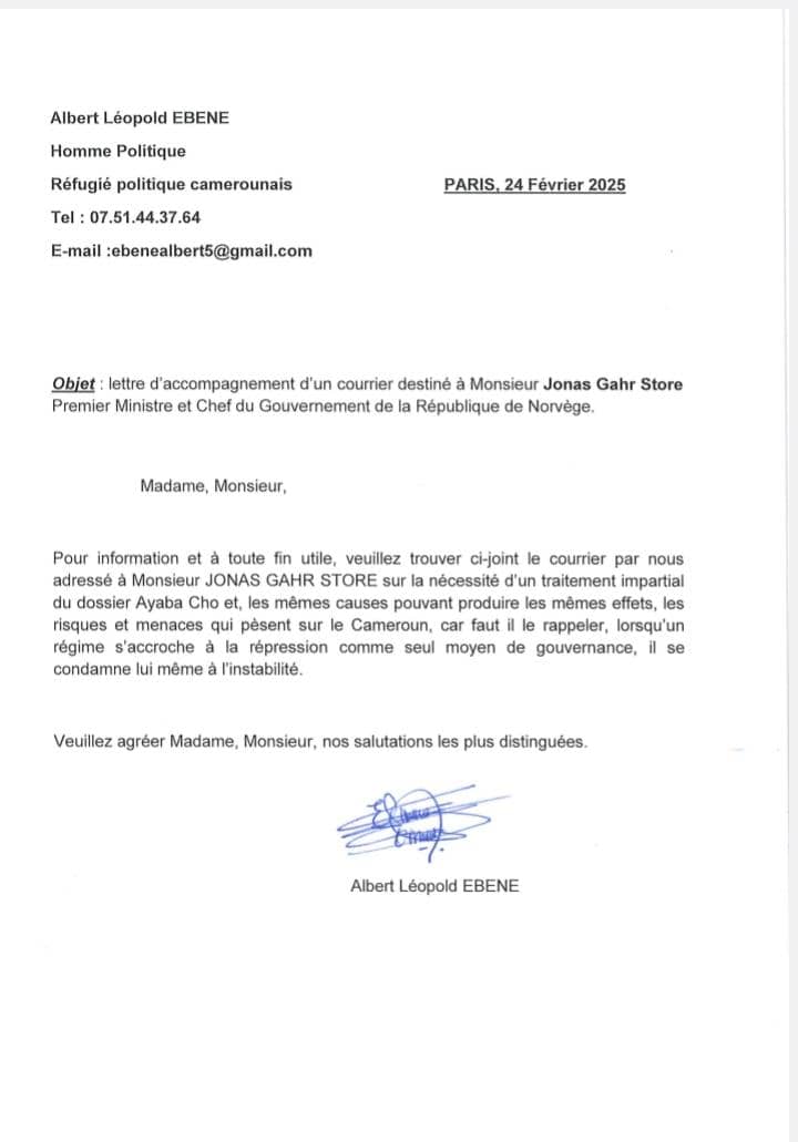 Dans une lettre adressée à l’attention de Jonas Gahr Støre, Premier Ministre et Chef du Gouvernement de la République de Norvège, l’ancien commissaire de police aux Renseignements Généraux et Réfugié politique camerounais en France Albert Léopold EBENE dit pourquoi l’un des leaders de la cause anglophone au Cameroun, arrêté en Norvège le 25 Septembre 2024, doit absolument être libéré.