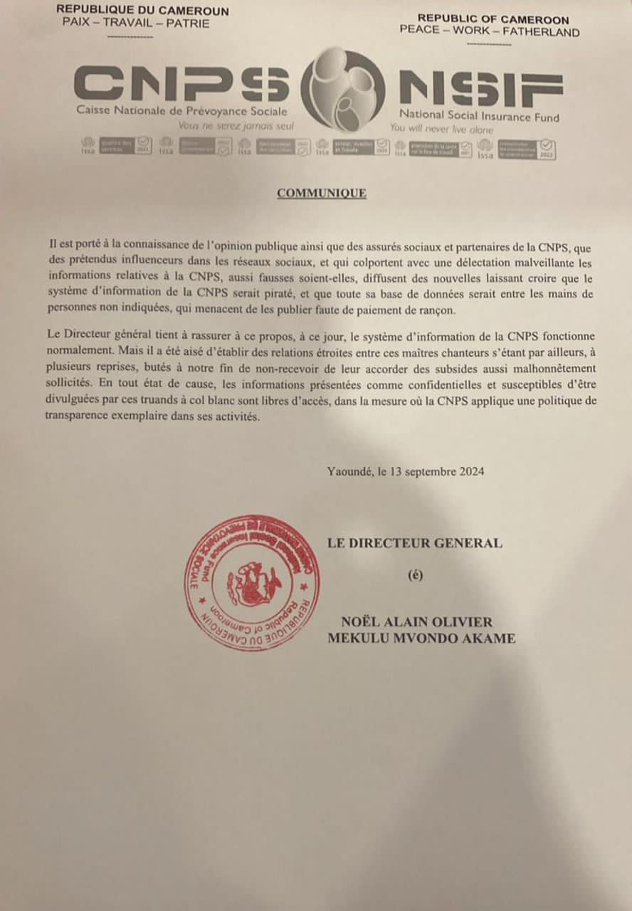 Depuis quelques jours, certains influenceurs annoncent dans les réseaux sociaux que la base de données de la Caisse Nationale de Prévoyance Sociale(CNPS) est entrain les mains des personnes non indiquées qui menacent de les publier faute de paiement de rançon. Tout en rappelant que la CNPS n’a rien a cacher, son directeur général rassure les assurés sociaux et leurs partenaires que le système d’information de la CNPS fonctionne normalement. Lire la suite…
