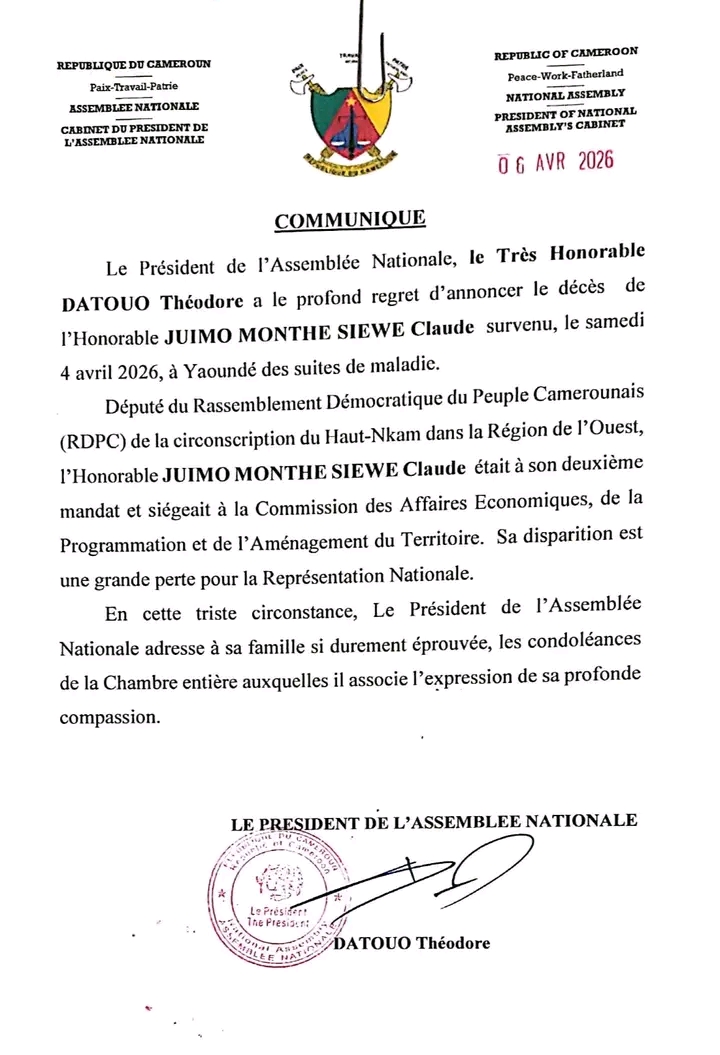 Dans un communiqué officiel publié ce lundi 06 avril 2026, le Cabinet du Président de l’Assemblée Nationale a annoncé le décès de l’Honorable Claude Juimo Monthe Siewe, survenu le week-end à Yaoundé.