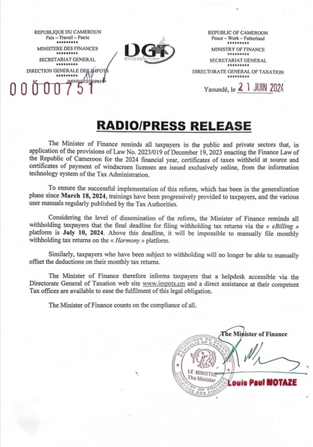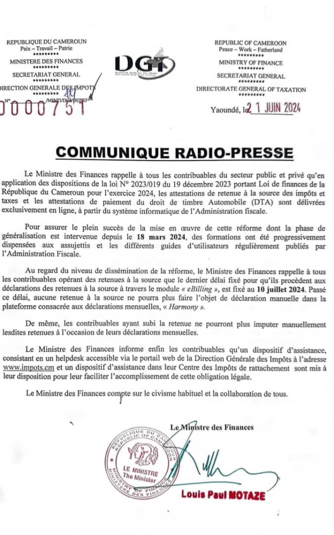 DÉCLARATIONS DE RETENUE À LA SOURCE DES IMPÔTS : Les attestations sont délivrées exclusivement en ligne…Le dernier délai est fixé au 10 juillet 2024.