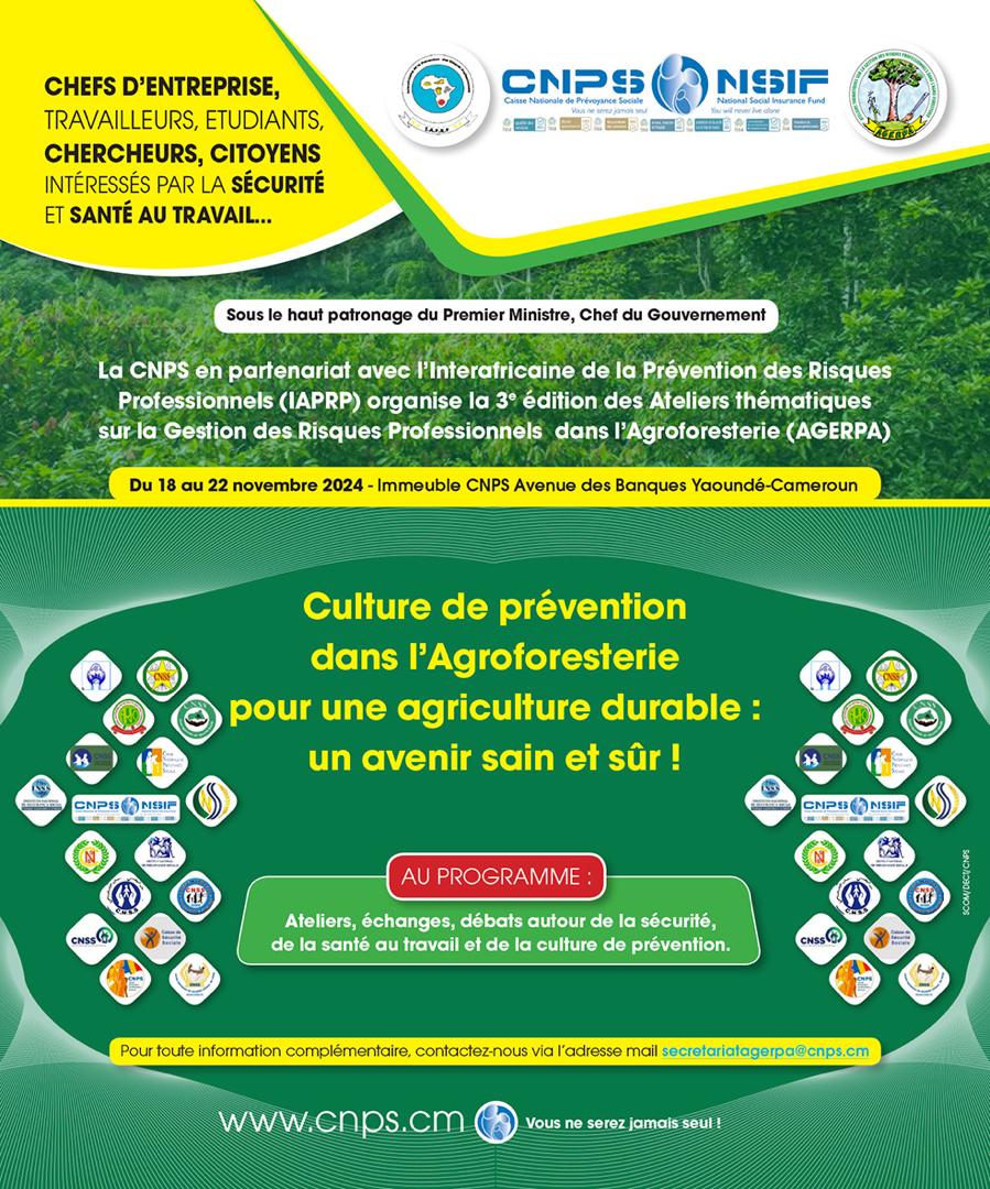Dans le cadre de la 3e édition des Ateliers thématiques sur la Gestion des Risques Professionnels dans l’Agroforesterie ( AGERPA), la Caisse Nationale de Prévoyance Sociale (CNPS), en partenariat avec l’Interafricaine de la Prévention des Risques Professionnels ( IAPRP), invite les chefs d’entreprises, les travailleurs, les étudiants, les chercheurs, les citoyens intéressés par la sécurité et la santé du travail, à prendre part aux activités qu’elle organise du 18 au 22 novembre 2024 à l’immeuble CNPS situé à l’Avenue des Banques à Yaoundé. Placé sous le haut patronage du Premier Ministre Chef du Gouvernement, l’événement va réunir les professionnels autour des Ateliers, débats sur la sécurité,la santé au travail et la culture de la prévention. Le thème de la rencontre : « Culture de prévention dans l’Agroforesterie pour une agriculture durable : un avenir sain et sûr», prévoit les interventions des experts mobilisés pour éduquer et sensibiliser le public sur les enjeux de l’ Agroforesterie. Ce rendez-vous important fait partie des principales missions de la CNPS relatives à la santé et à la sécurité des travailleurs de divers corps de métiers.