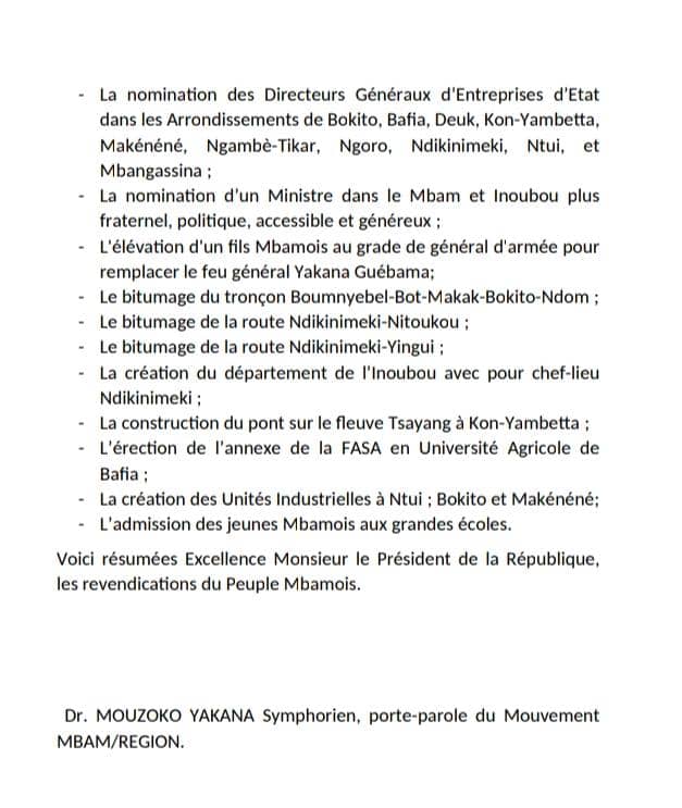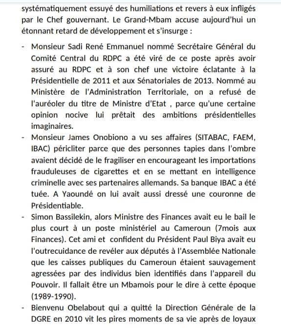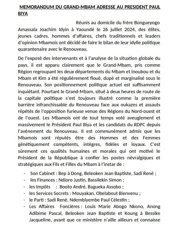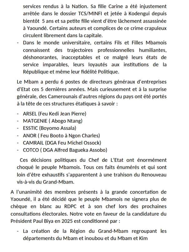 Au vu des problèmes de développement constatés et des humiliations infligées aux personnes originaires de ses deux départements(Mbam-et-Inoubou et Mbam-et-Kim) qui exigent entre autres la création de la RÉGION DU GRAND MBAM, ceux-ci estiment qu’ils ont été régulièrement floués, dupés et marginalisés sous le Renouveau. Il a été décidé à l’unanimité que le peuple Mbamois ne signera plus de chèque en blanc au Rdpc et à son chef lors des prochaines consultations électorales. Et qu’en conséquence, leur vote en faveur de la candidature du président Paul Biya en 2025 sera conditionné… Comme cerise sur le gâteau, ce mouvement demande la nomination d’un membre du gouvernement originaire du Mbam-et-Inoubou plus politique, fraternel, accessible et généreux . Lire le mémorandum adressé au président Paul Biya.