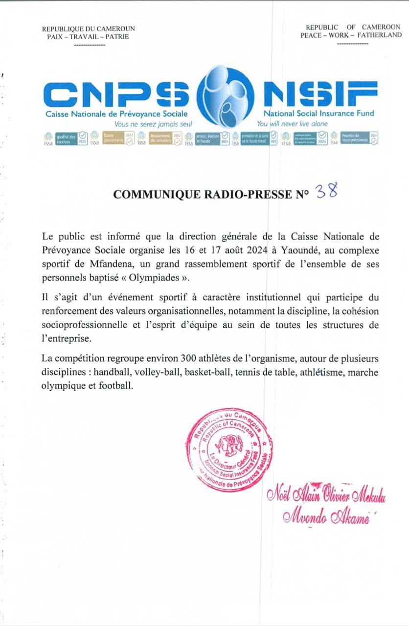 OLYMPIADE DE LA CNPS : La direction générale de la CNPS organise un grand rassemblement sportif au complexe sportif de Mfandena à Yaoundé.