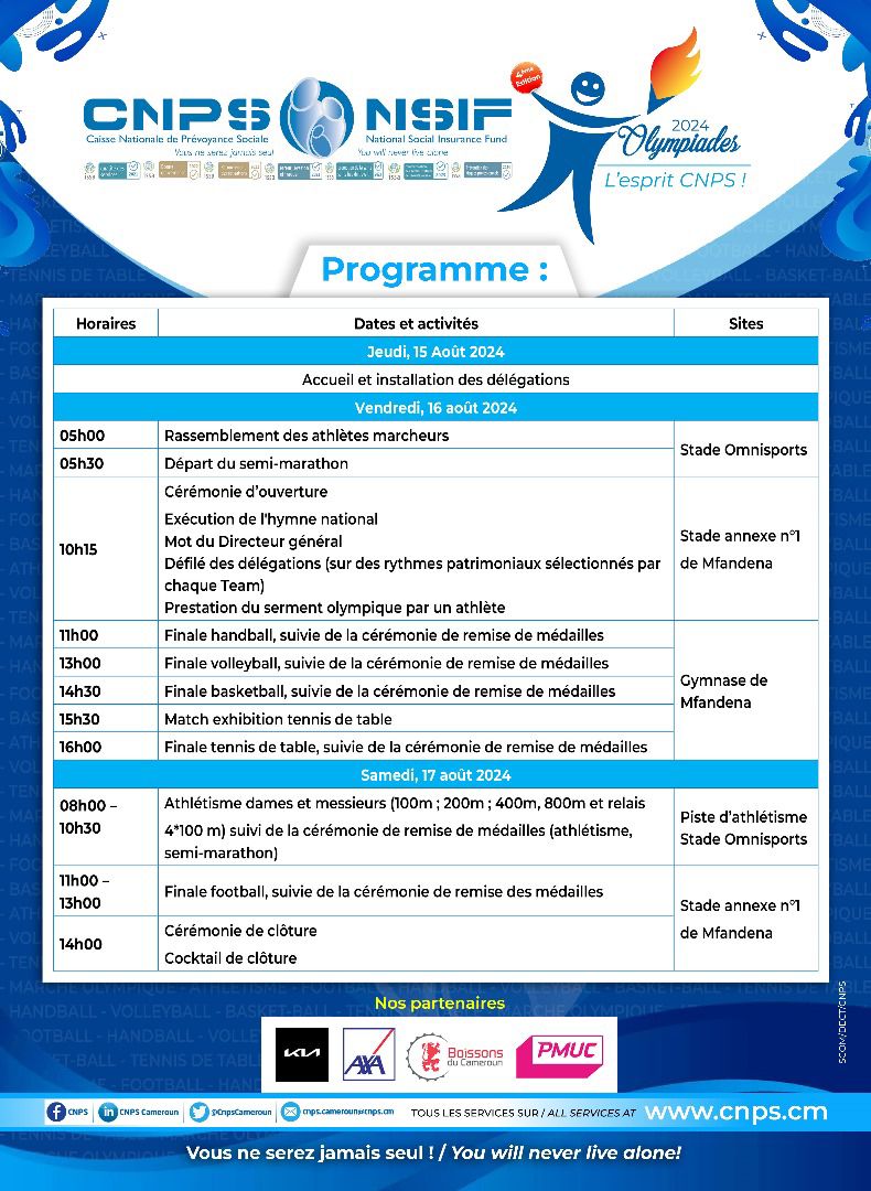 La compétition qui se tiendra du 16 au 17 août 2024 regroupe environ 300 athlètes autour de plusieurs disciplines. Cet événement sportif à caractère institutionnel participe du renforcement des valeurs organisationnelles, notamment la discipline, la cohésion socioprofessionnelle et l’esprit d’équipe au sein de toutes les structures de la Caisse Nationale de Prévoyance Sociale(CNPS). Rappelons que les éliminatoires ont commencé en début du mois d’août, dans les différentes régions du Cameroun. Lire le programme de l’événement…