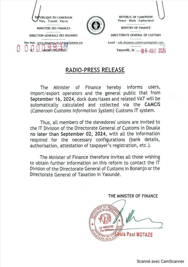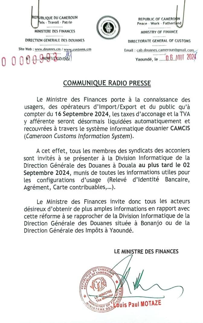 Le Ministre des Finances,Louis Paul Motaze, invite les membres des syndicats des acconiers à se présenter à la division informatique de la direction générale des douanes à Douala au plus tard le 02 septembre 2024,munis de toutes les informations utiles pour les configurations d’usage(Relevé d’Identité Bancaire, Agrément, Carte contribuable,…).