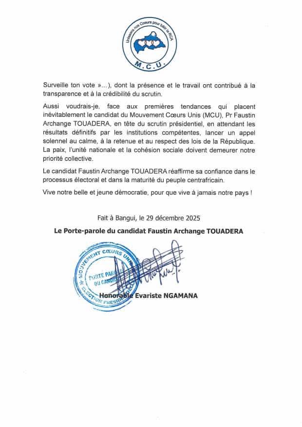 Par la voix de l’Honorable Évariste Ngamana, le Mouvement Cœurs Unis (MCU) a exprimé sa satisfaction devant ce qu’il qualifie de « réussite majeure pour la démocratie centrafricaine ». Malgré les défis logistiques et sécuritaires inhérents au contexte régional, l’élection semble s’être tenue dans un climat de calme relatif sur l’ensemble du territoire ainsi qu’au sein de la diaspora.