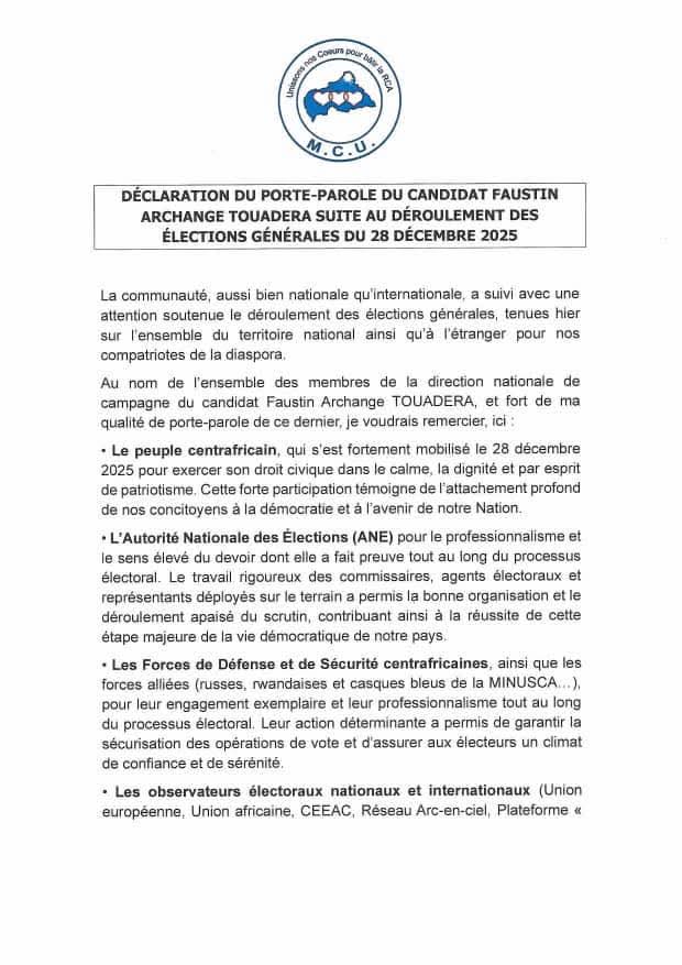 Par la voix de l’Honorable Évariste Ngamana, le Mouvement Cœurs Unis (MCU) a exprimé sa satisfaction devant ce qu’il qualifie de « réussite majeure pour la démocratie centrafricaine ». Malgré les défis logistiques et sécuritaires inhérents au contexte régional, l’élection semble s’être tenue dans un climat de calme relatif sur l’ensemble du territoire ainsi qu’au sein de la diaspora.