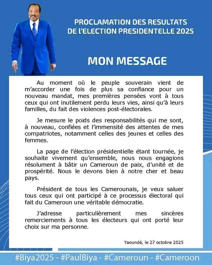 Le Message de Paul Biya: Pensée aux personnes décédées au cours de la crise post électorale