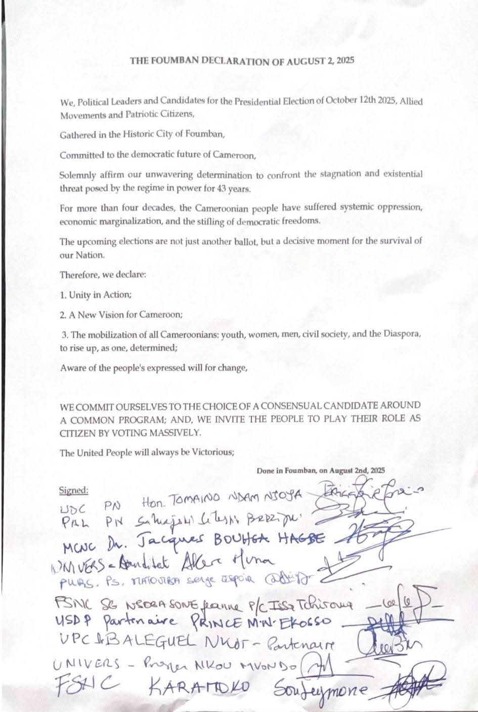 Réunis dans la ville de Foumban, le 02 août 2025, les leaders politiques et candidats à l’élection présidentielle du 12 octobre 2025, s’engagent dans le choix d’un candidat consensuel autour d’un programme commun. Ils invitent le peuple à jouer sa partition citoyenne en votant massivement… Lire la déclaration de Foumban