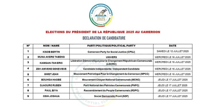 Avec le dépôt de candidature du président national du Rassemblement Démocratique du Peuple Camerounais (RDPC), Paul Biya, enregistré ce 17 juillet 2025, après celle de Jacques Bouhga Hagbe du Mouvement Citoyen National Camerounais (MCNC), et de Djaouro Ruben du Parti National des Patriotes Camerounais (PNPC) déposé à la Délégation Régionale de l’Est , l’organisme de gestion des élections au Cameroun est déjà à 09 candidatures enregistrées. Celle de Maurice Kamto sous la bannière du Manidem est annoncée pour être déposée demain. Rappelons que le délai de dépôt des dossiers des candidatures à la présidentielle du 12 octobre 2025 est fixé au lundi 21 juillet 2025 à minuit.
