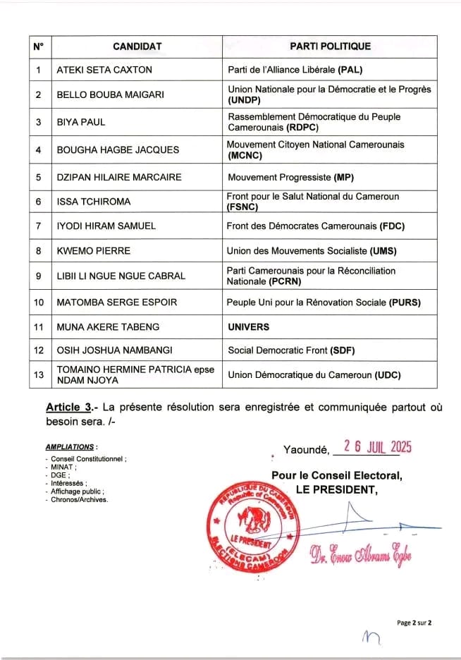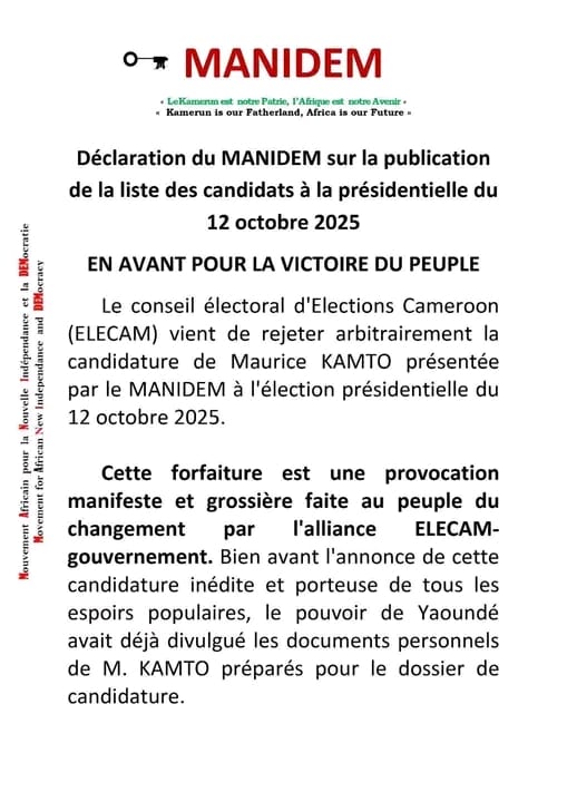 Avec 83 candidats enregistrés , le conseil électoral d’Elections Cameroon (Elecam) a publié ce samedi 26 juillet 2025 la liste des candidats retenus à à la suite d’un examen des dossiers reçus par la direction générale d’Elecam. Face à l’absence du nom de Maurice Kamto, candidat du Manidem, Anicet Ekane son président a fait une déclaration…
