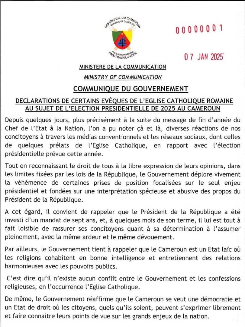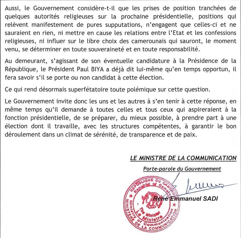 À la suite des déclarations de certains évêques de l’église catholique romaine au sujet de l’élection présidentielle de 2025 au Cameroun, le ministre de la communication, porte parole du gouvernement Camerounais, René Emmanuel SADI, indique que les prises de position tranchées de quelques autorités religieuses sur la prochaine présidentielle relèvent manifestation de pures supputations… Lire le communiqué de presse du Mincom