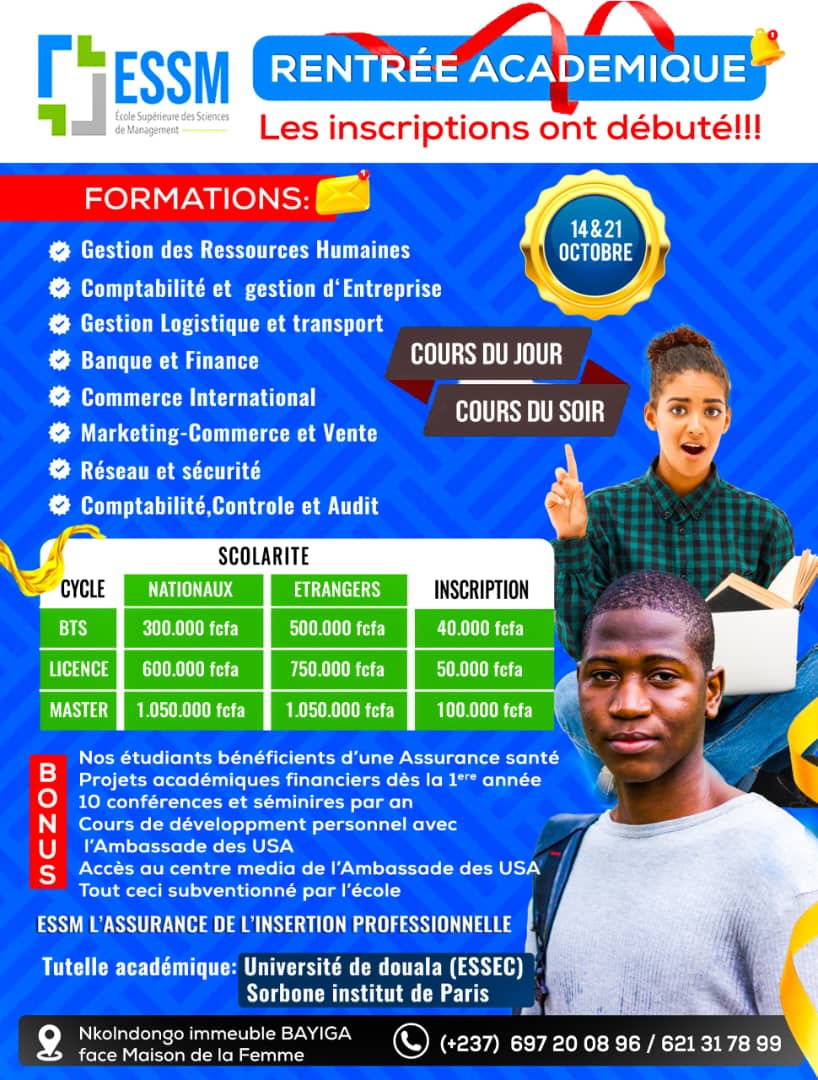 L’ESSM, l’école des leaders, qui forment pour l’obtention des BTS, LICENCE et MASTER dans plusieurs spécialités, invitent les étudiants à s’inscrire avant le 25 septembre 2024 pour bénéficier d’un laptop, de 10 formations certifiantes/an, d’une assurance santé, des cours de développement personnel de l’ambassade des USA, d’un voyage scolaire, et d’un montage et suivi des projets avec accompagnement financier.