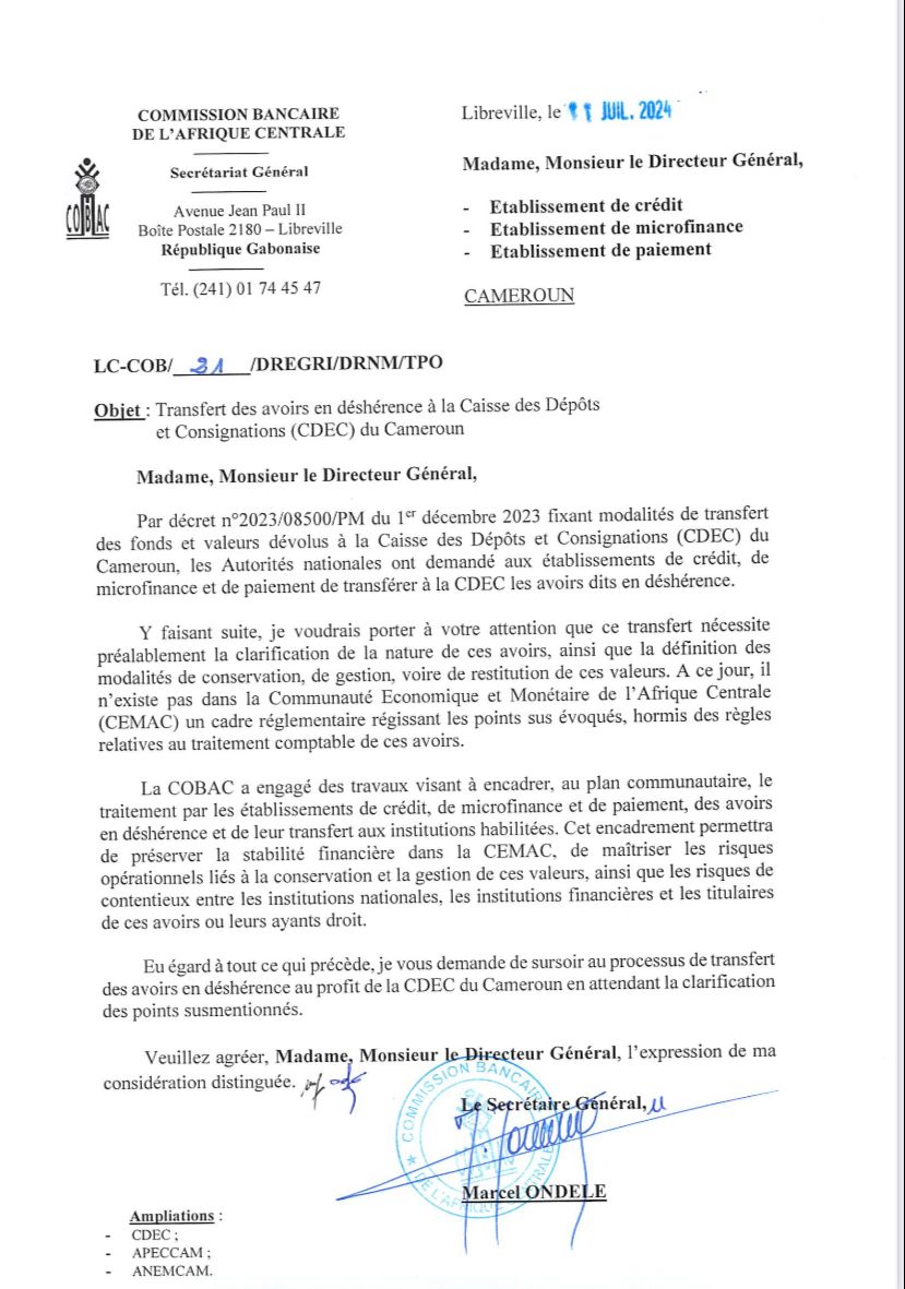 Alors que la Caisse des Dépôts et Consignations(CDEC) du Cameroun mettait la pression sur les établissements de crédits et les microfinances de leur transférer des fonds en déshérence sous peine de sanction, le Secrétaire Général de la Commission Bancaire de l’Afrique Centrale (COBAC), Marcel Ondele, vient de demander  de surseoir au processus en attendant les clarifications afin de préserver les risques opérationnels et la stabilité financière dans la CEMAC…